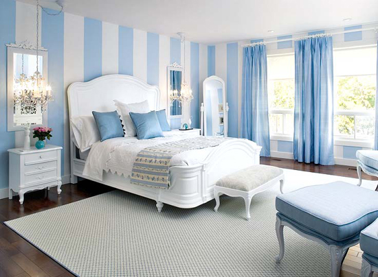 Una hermoso de diseño de dormitorio matrimonial con combinación entre el color azul y el blanco y una original estructura a rayas verticales con accesorios de color blanco.
